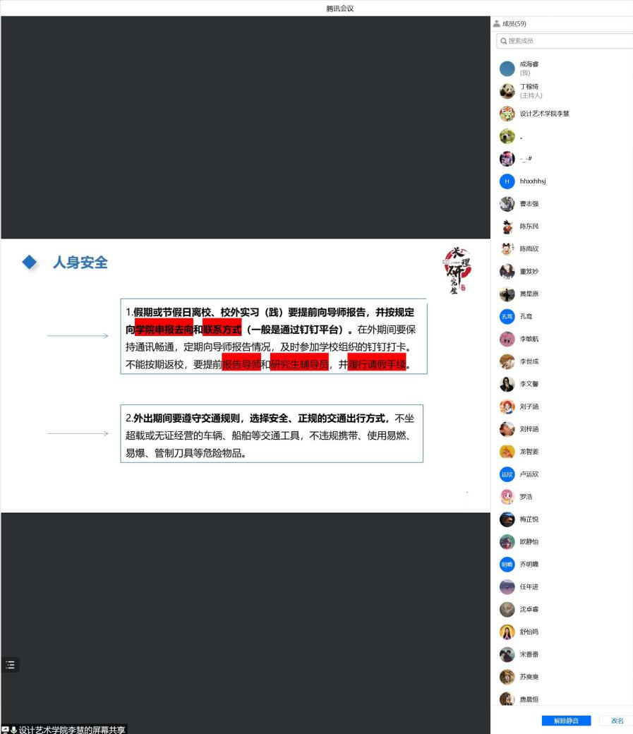 首先,研究生辅导员李慧从人身安全、财产安全、消防安全、食品安全、网络安全、国家安全等6个方面的安全问题进行了详细解读,对于刚入学的研究生来说,最容易忽视安全问题,接受安全教育,学习安全知识,能为我们的日常学习生活保驾护航。在专题学习的过程中,李慧以身边鲜活的案例为素材提醒同学们要牢记各项安全知识,尤其是研究生实验室安全问题、反电信诈骗问题,针对目前新生防范意识薄弱现象,给出了有效的解决方法。