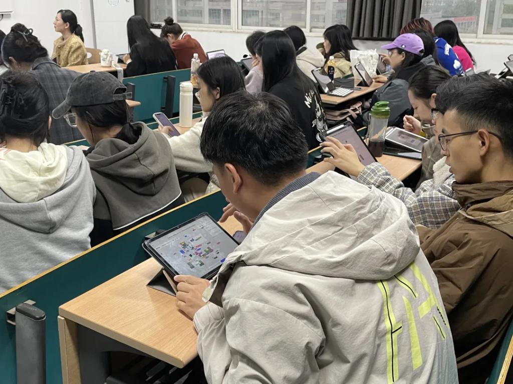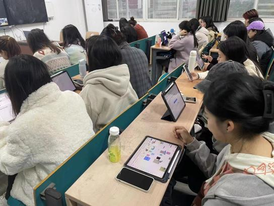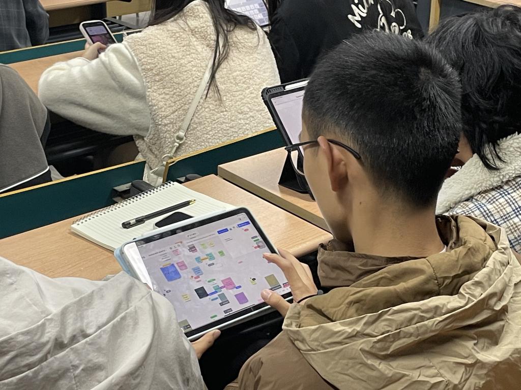 在app界面上可以看到带着名字的每个同学的光标在屏幕上同时移动,还可以看到其他同学的回答,有着良好的体验感和交互感。学生们大多都是第一次使用“Miro”app,感觉非常奇妙,现场氛围活跃。无论是线上还是线下的每位同学都参与其中,围绕老师提出的问题展开了热烈的讨论,积极踊跃地在学习平台中“贴”上自己的观点与想法。