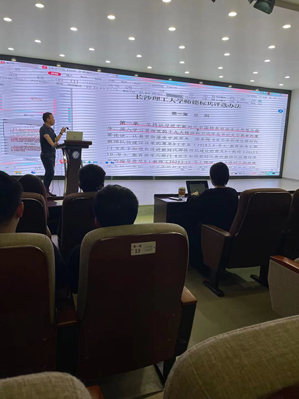 李伟结合近年来我院先后涌现出的谢琪、刘洵、王龙等校级师德标兵和潘晓霞、邓寒松等为代表的许多爱岗敬业的优秀典型事迹,带领全体教职工集体学习了《新时代高校教师职业行为十项准则》、《长沙理工大学师德标兵评选办法》、《中共长沙理工大学委员会关于建立健全师德师风建设长效机制的实施办法》和《中共长沙理工大学委员会师德失范行为处理及师德考评实施细则》四个文件。