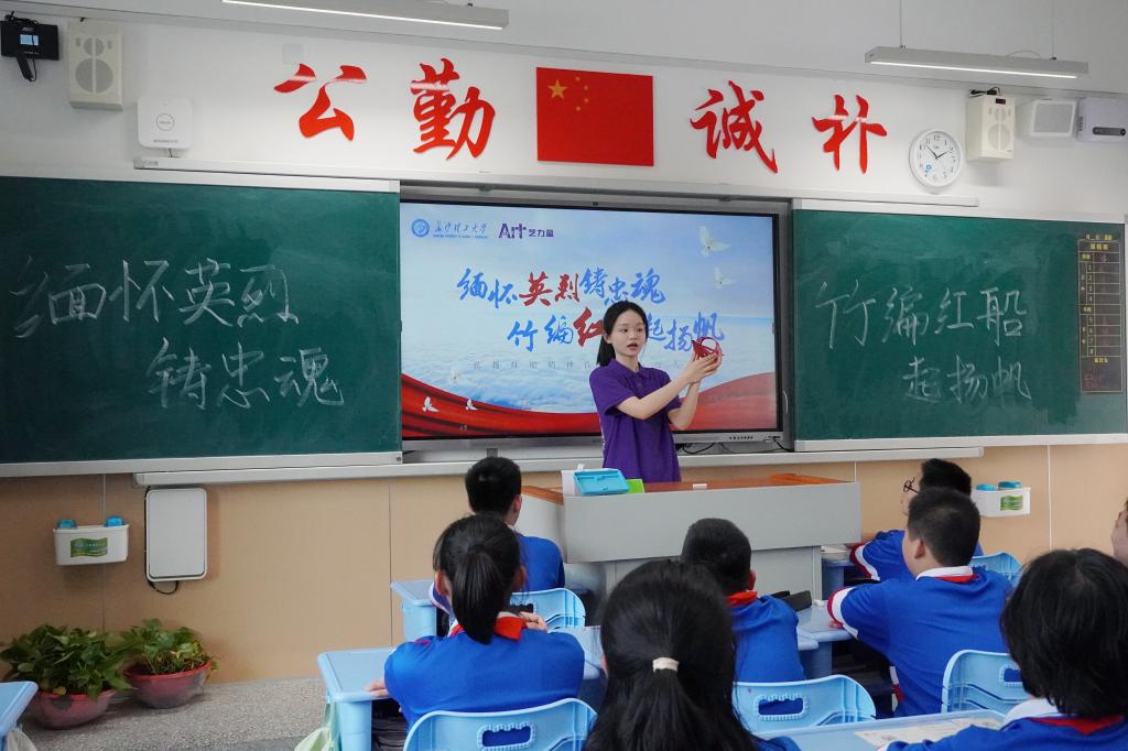 “为中华之崛起而读书!”在青年志愿者的带领下,长沙市南雅双语实验中学的同学们喊出铮铮誓言。清明节来临之际,长沙理工大学“艺力量”青年志愿者协会前往长沙市南雅双语实验中学开展主题为“缅怀先烈铸忠魂,竹编红船起扬帆”的实践活动,将非遗文化和红色文化有机结合,带领青年感受“红船精神”,赓续红色血脉,从中汲取奋进力量。