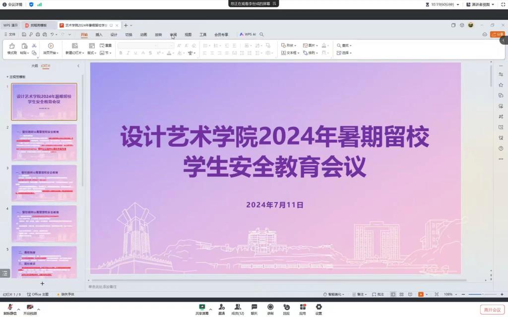 为切实做好2024暑期留校学生教育管理工作,维护校园安全稳定,7月11日下午2时,设计艺术学院于腾讯会议召开2024年暑假留校学生安全教育会议,学工办辅导员、全体留校学生参加会议,会议由2021级辅导员李世成主持。