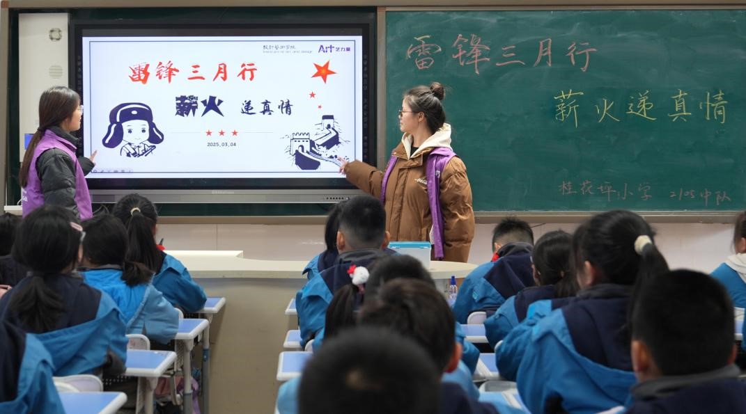 第62个学雷锋纪念日前夕,一场由长沙理工大学设计艺术学院“艺力量”青年志愿协会策划的公益课堂正在长沙市天心区仰天湖桂花坪小学开展。来自长沙理工大学的志愿者们正在引导小朋友们以“角色扮演”的形式沉浸式投入到雷锋乐于助人、艰苦奋斗、锐意创新的一个个事迹之中。