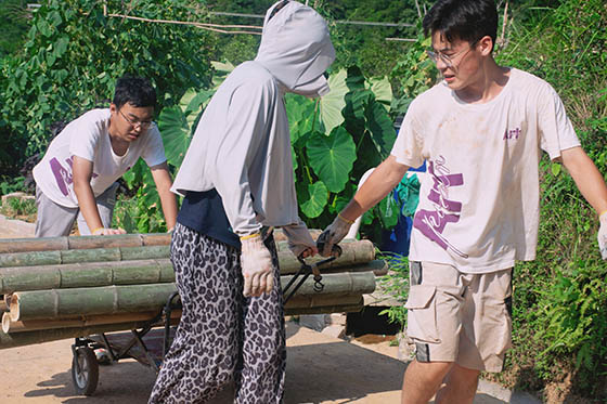 上午八时,叮叮当当的敲打声便不绝于耳,文卫民老师和实践团成员们开始了最后一天的施工任务。钢筋打入土中,再将长短各异的竹子并排埋置于土中,形成波浪形的围栏与门头。烈日炎炎,毫无阴凉可乘,大家仍干劲十足,卯足了劲地向最终成品努力!所有竹子全部落地后,一组进行其防腐油的刷漆工作,另一组则配合工人师傅完成草皮的铺设工作,随着一块块草皮的铺设完成,大家预想中的方案一步步化为现实,成就感满满!随后将鲜花种在花圃里,为草皮鲜花浇上水,新鲜欲滴的花儿散着淡淡花香,一切辛苦在看到最终成果的那一刻全部烟消云散,大家激动地欢呼着,邻里街坊也都前来参观感叹,我们竣工啦!
