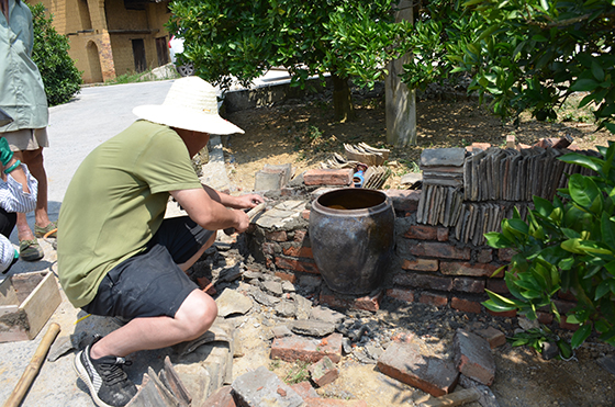 项目的落地,施工成果的逐渐显现。村民的干劲越来越足,脸上的笑容越发灿烂。目前,小围墙已初见雏形,在小围墙的砌筑过程中,团队成员将收集的坛子、水阀运用到了庭院改造建设中。