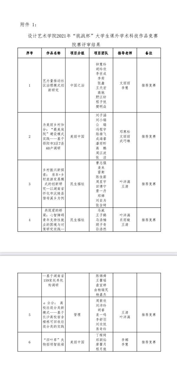 为积极响应国家“双创”号召,培养艺术学子科技创新能力,提高艺术学子的综合素养,激发艺术学子创新精神与挑战自我的勇气。艺术学院严格按照公平、公正、公开的原则评审各参赛项目,其中由文丽丽、李慧老师指导的《艺力量推动社区治理模式创新研究》;由邓松寒、文丽丽、武巧琳老师指导的《为美丽乡村加分:最美庭院建设模式实践》;由叶洋滈、王清老师指导的《乡村振兴新探索: 房车+乡村旅游发展模式的创新研究》;由叶洋滈、肖雨璇、王清老师指导的《共筑爱的桥梁:心智障碍青年支持性就业的困境与对策研究实践》;由王清、叶洋滈老师指导的《e 分分: 高校垃圾分类新模式》;由李娜、李慧老师指导的《四叶草失物招领智能箱》突出重围获得校赛资格。