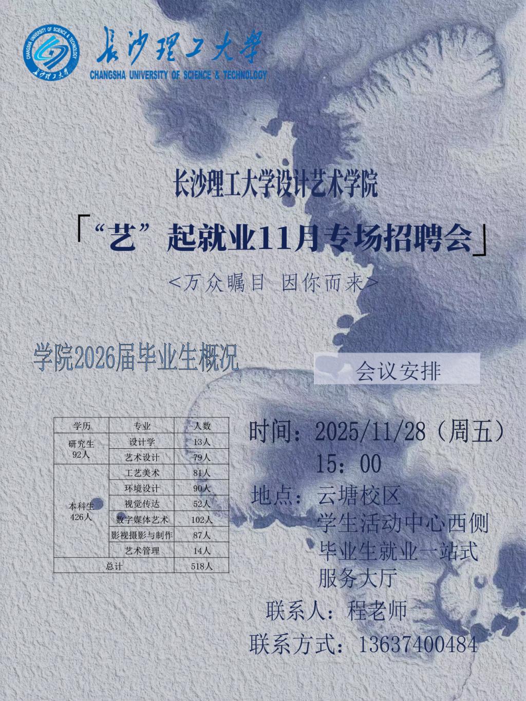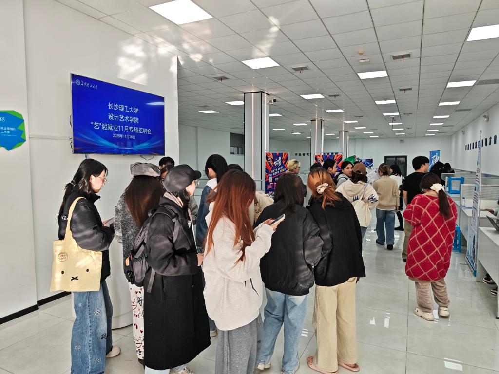 11月28日下午,长沙理工大学设计艺术学院“艺”起就业11月专场招聘会在云塘校区学生活动中心西侧一楼毕业生招聘大厅成功举办。本次招聘会聚焦2026届毕业生就业需求,搭建起企业与学子双向奔赴的优质平台,现场人头攒动、气氛热烈,求职洽谈氛围浓厚。