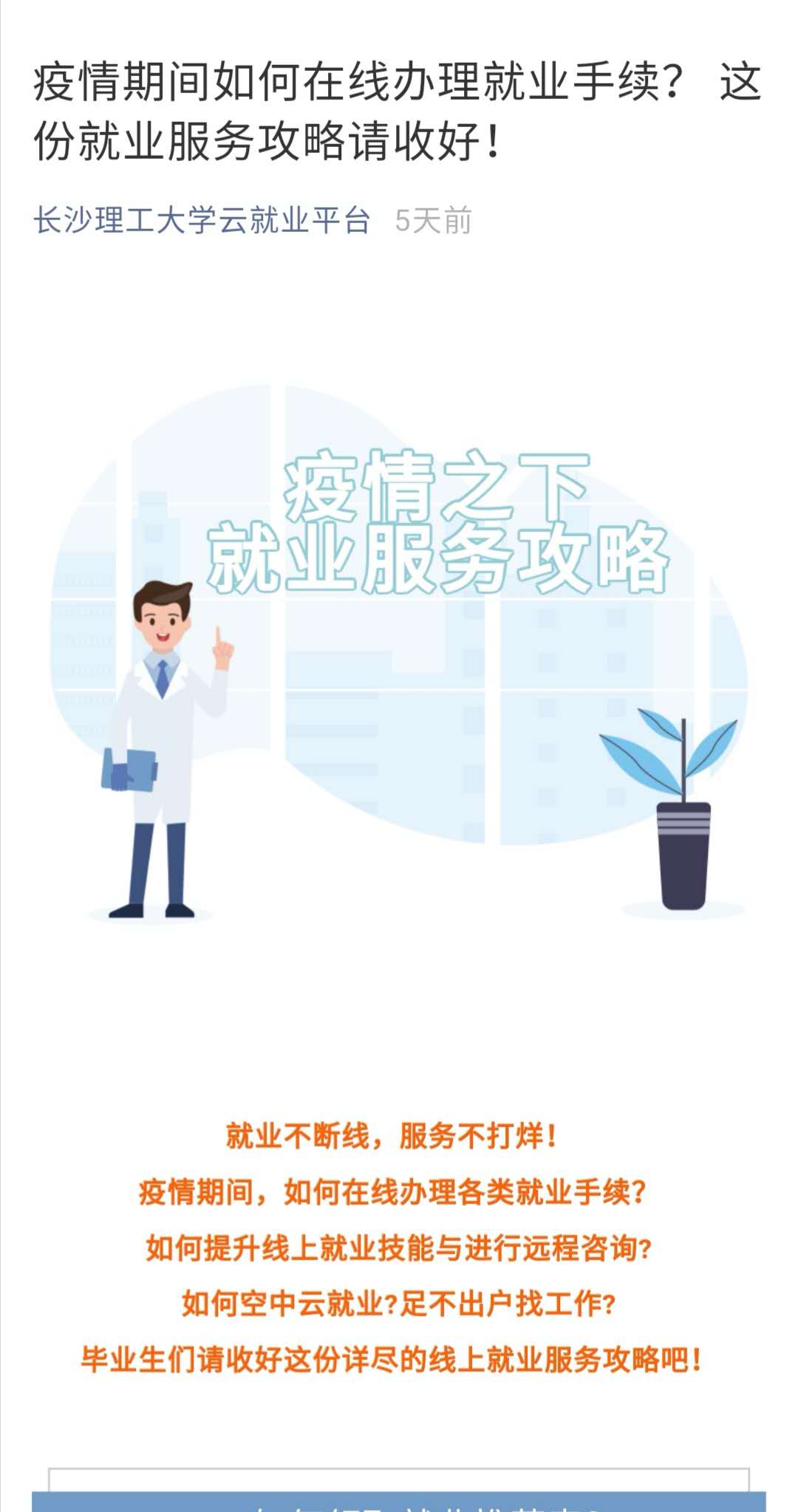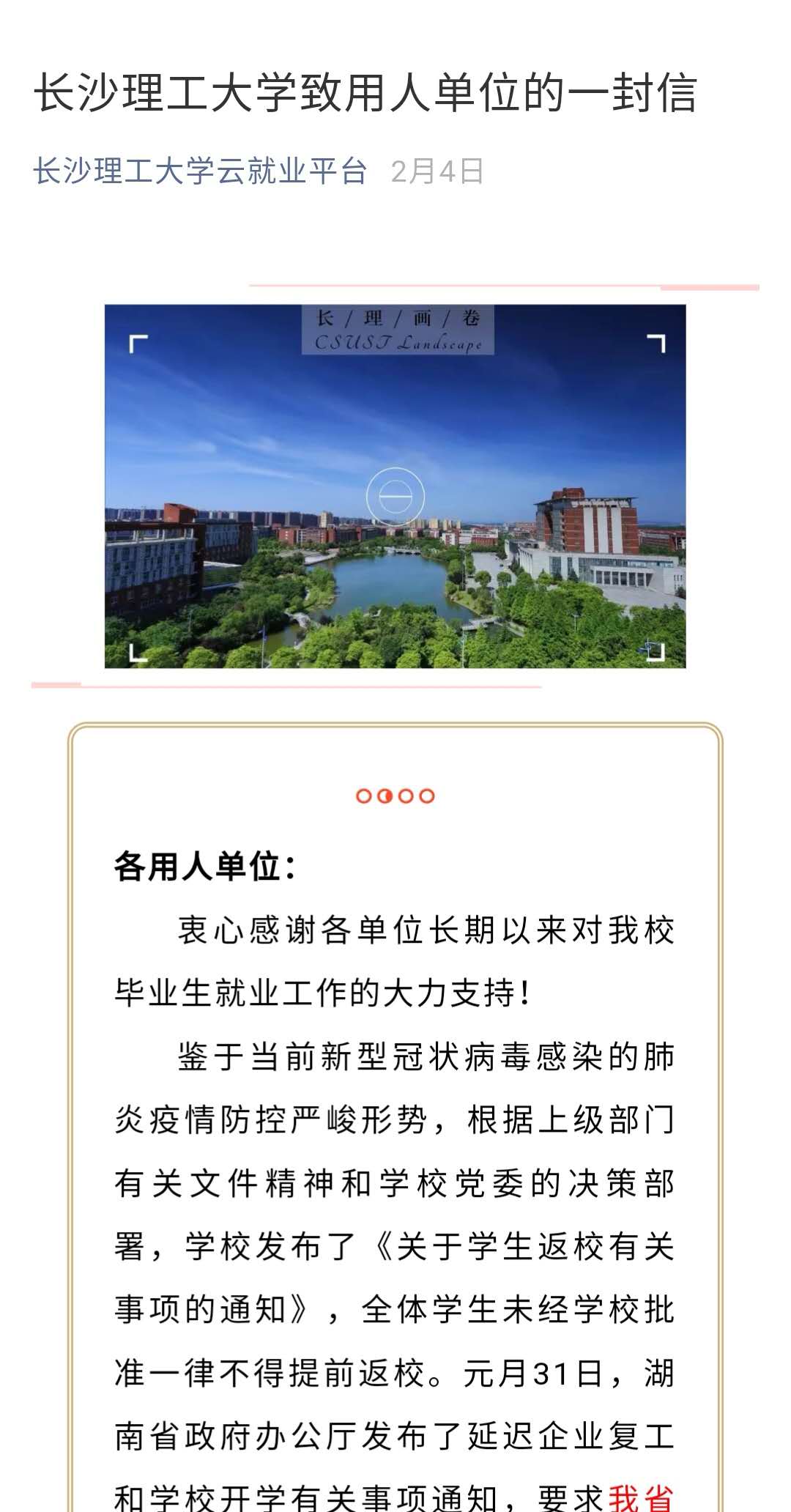 自新冠肺炎疫情发生以来,长沙理工大学坚决贯彻落实习近平总书记关于强调多措并举做好高校毕业生就业工作的有关讲话精神,切实提高政治站位,一把手靠前指挥,主动应对挑战,创新工作方式,通过“六个坚持”组合拳,扎实推进毕业生就业各项工作,促进毕业生更充分就业。
