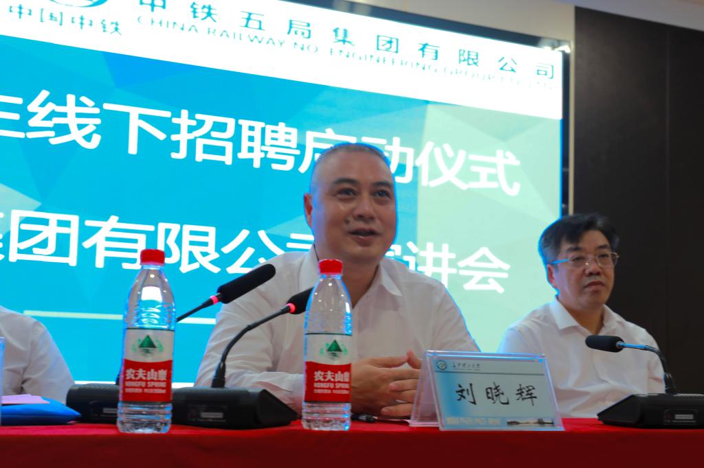 刘晓辉热忱欢迎长沙理工大学的学子把握机会,加入中铁五局这个优秀的集体,积极投身到国家建设和发展中来,在实践中成就自己,成就未来,他热情洋溢的讲话,求贤若渴的心情,赢得了全场师生阵阵热烈的掌声。