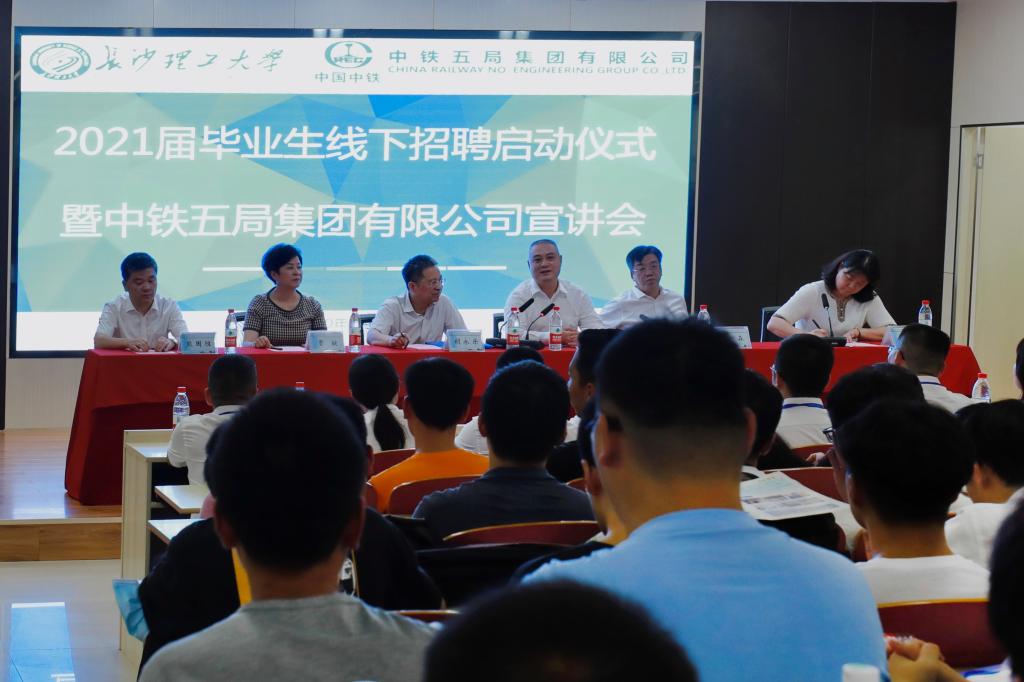 2020年9月3日下午4:30,长沙理工大学工科三号楼A307报告厅座无虚席,气氛热烈。在做好疫情防控的基础上“长沙理工大学2021届毕业生线下招聘启动仪式暨中铁五局集团有限公司宣讲会”正式启动。中铁五局集团总经理刘晓辉、湖南省就业指导中心主任曹敏、学校纪委书记胡永乐出席了启动仪式。此次招聘会面向雷竞技官网提供岗位300余个,涉及土木类、机械类、四电类、经济管理类等20多个专业。