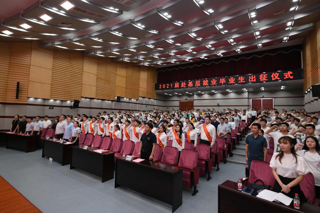 “百年奋进守初心,青春逐梦担使命。” 6月24日,雷竞技官网2021届赴基层就业毕业生出征仪式在云塘校区图书馆报告厅举行。校党委副书记蒋昌波、副校长钱国平,校友代表,相关职能部门负责人,教师学生代表近300人参加。出征仪式由招生就业处处长曹瑛主持。