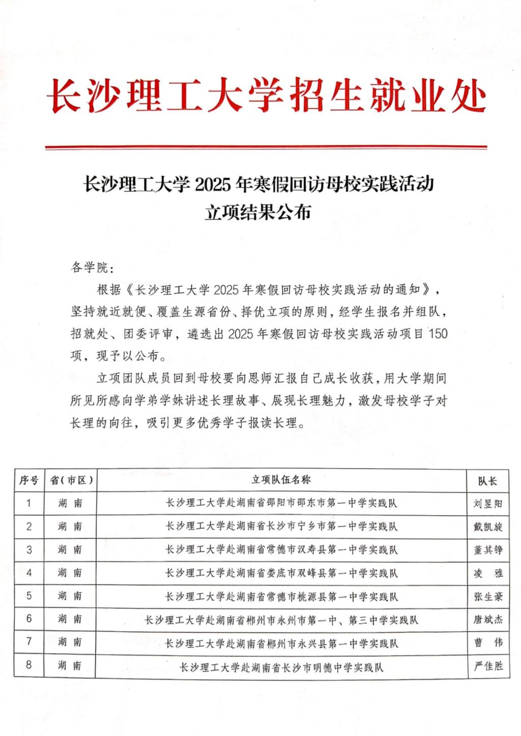长沙理工大学2025年寒假回访母校实践活动立项结果公布